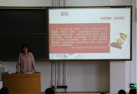 员工第六党支部书记张瑱作题为“学党史,不忘初心,牢记使命,发挥新时代青年的担当”的报告。她简述了党史的发展脉络及学习意义,并从没有共产党就没有新中国、没有共产党就没有社会主义中国、没有共产党就没有中国特色社会主义、党的百年光辉历程带来的深刻警示四个方面向同学们讲述了中国共产党的发展历程。她强调,青年要勇于奉献,敢于担当,让青春在奋发向上中焕发出更加绚丽的光彩。