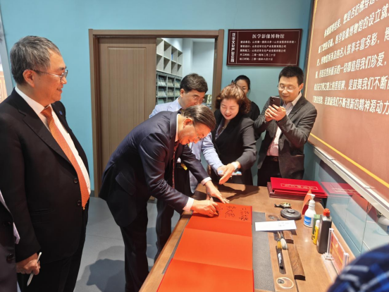 4月12日,韩国仁济大学副董事长李大熙教授一行参观医学影像博物馆。参观期间,讲解员王晓煜全程英文与李大熙教授一行交流,体现出良好的双语讲解素养。参观结束后,仁济大学教授欣然在博物馆的签字簿上签字留言。