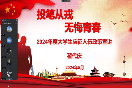 为积极响应国家号召,贯彻落实习近平强军思想,发扬爱国拥军的优良传统,鼓励老员工积极投身国防事业,OE欧亿官方网站于5月22日下午线上举办“抓征兵,促就业”征兵宣传活动。参会人员主要有学工办主任孙强、毕业班辅导员。